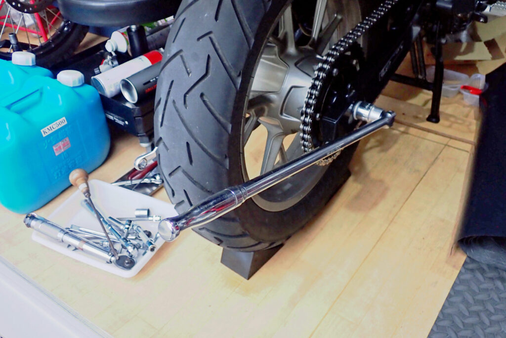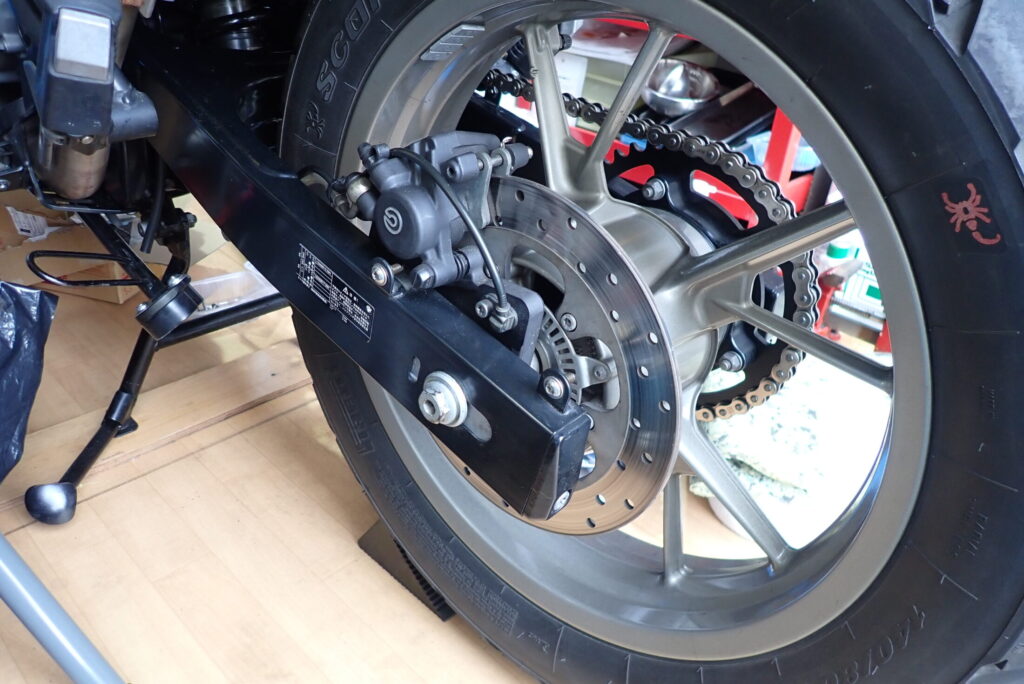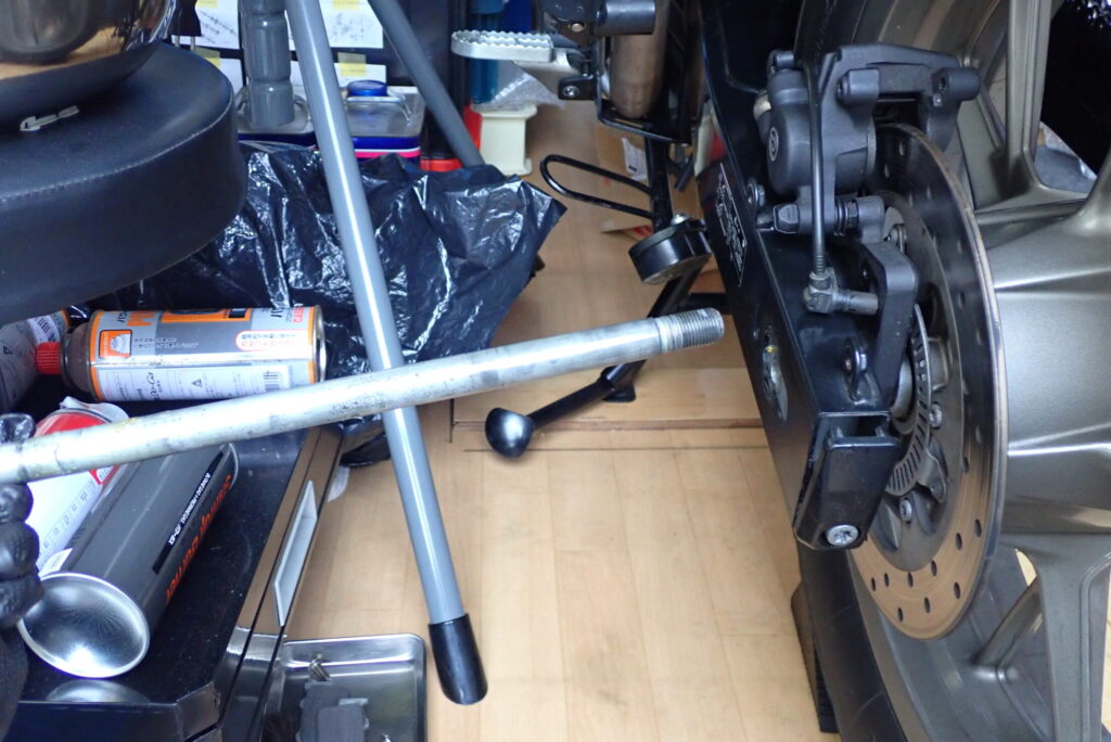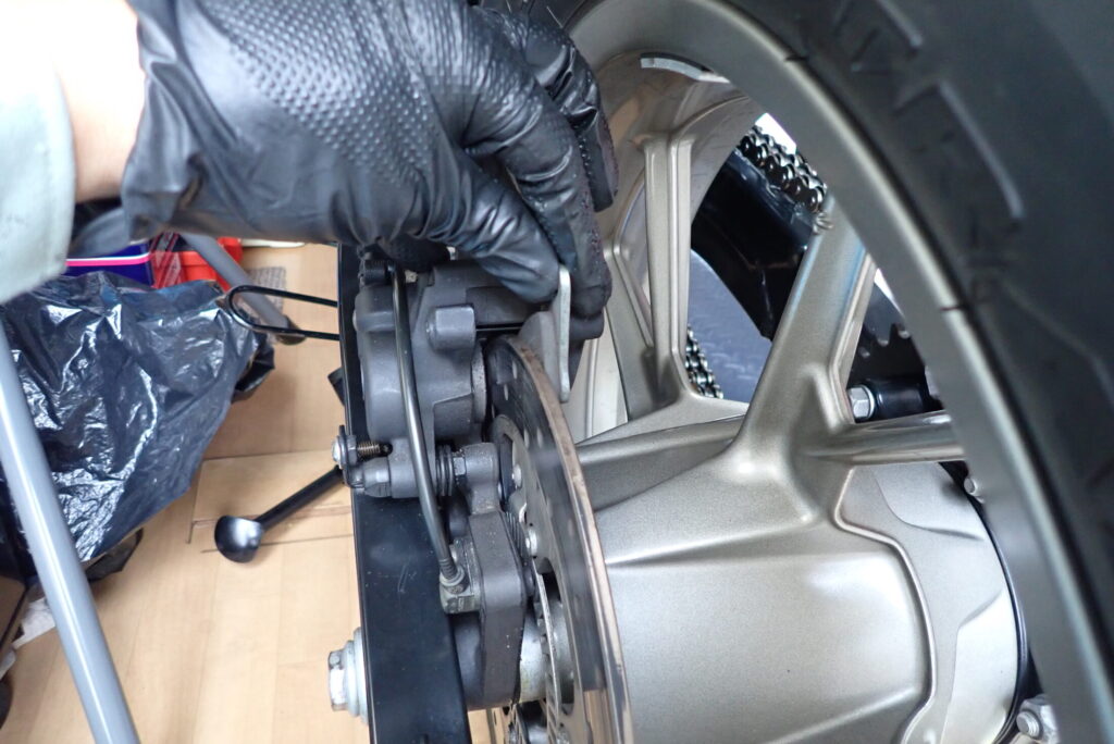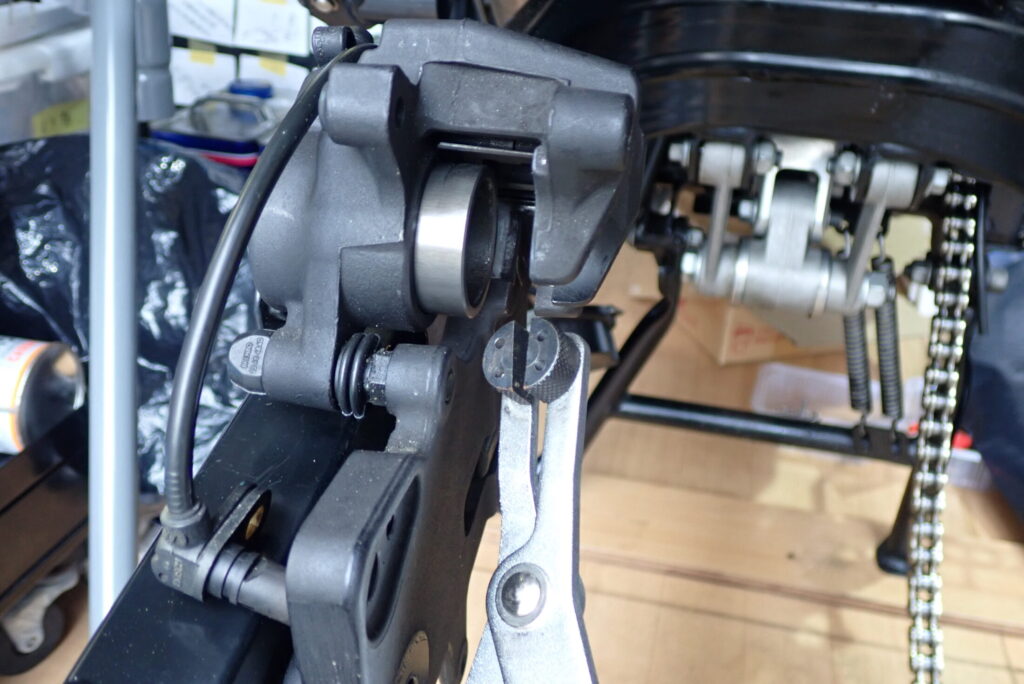 ピストンにアクセスするためにリアタイヤを外します。