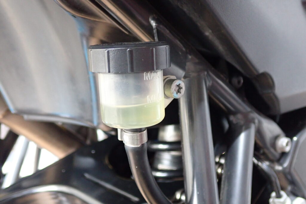 ピストンをキャリパー内部に押し戻すと、その分だけブレーキフルードがホースを逆流し、マスターシリンダーのリザーバータンクへと戻ります。この際、過去にフルードを継ぎ足していた場合、タンクからフルードが溢れ出してしまうことがあります。ブレーキフルードは塗装を傷めるため、作業前にリザーバータンクのキャップを開け、液量が多い場合はあらかじめスポイトなどで少し抜いておくのが安全策です。