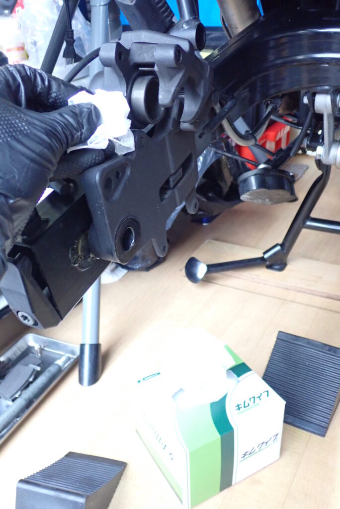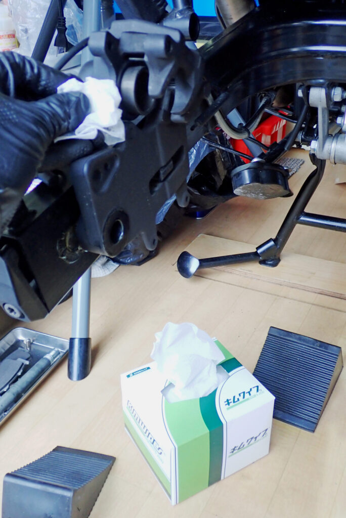 ブレーキピストンの汚れは頑固そうではなかったので、ここではキムワイプで優しく汚れを拭き取ることにしました。