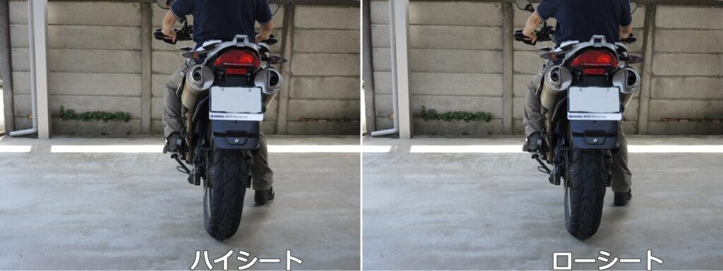 当たり前ですが,足つきはハイシートの方が悪くなります.しかし,シートの見た目ほどシート高が高くは感じません.シートが柔らかく,お尻全体を包み込むように沈んでくれるので,感覚的にはシート高は2cm程度高くなったと感じる程度です.