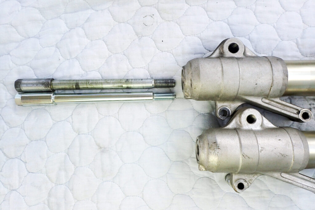 ですが,中古で入手したフロントフォークには,私の車両のアクスルシャフトは取り付けられませんでした.よくよく調べてみると,アクスルシャフトのネジ径が変わるモデルチェンジがあったようです.