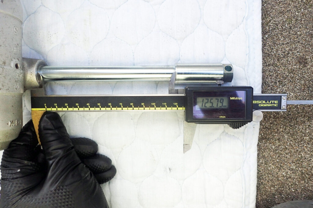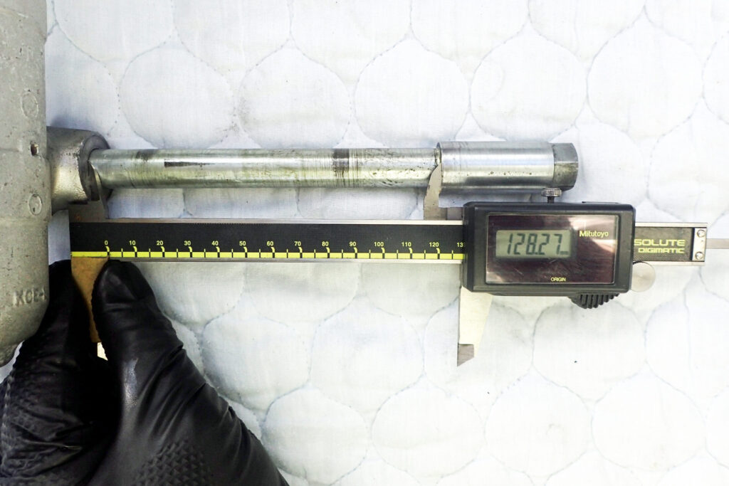 アクスルシャフトをフォークのアンダーブラケットにねじ込んで測ってみると,ネジ径12mmのシャフトは125.79mm