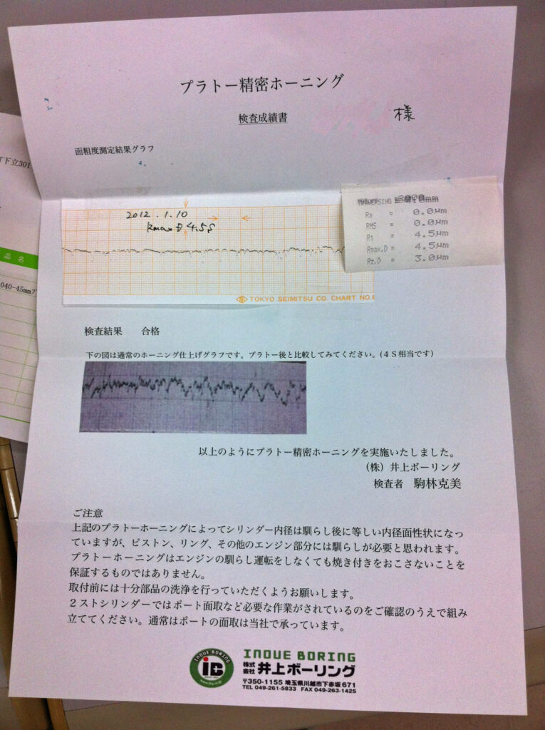 今回は、実際にシリンダーを預けて戻ってきた際の様子や、同封されていた検査成績書の内容を交えながら、なぜこの加工が「究極の慣らし済み状態」と言われるのかを詳しく解説します。