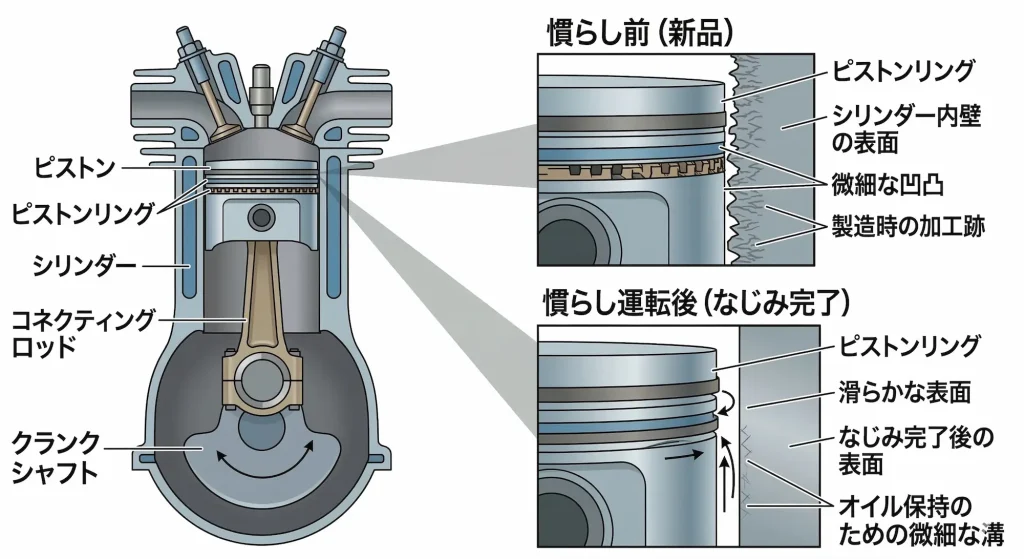 「慣らしが終わった状態に近い」とはいえ、ピストンリングやその他の回転部品は新品の状態です。