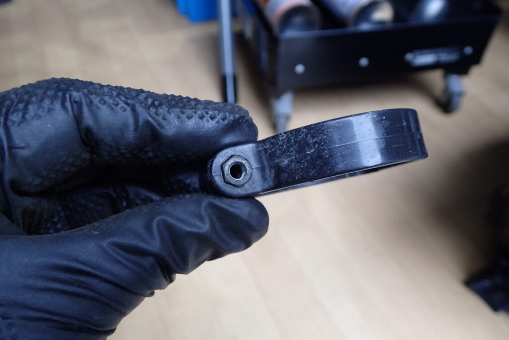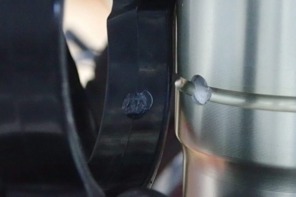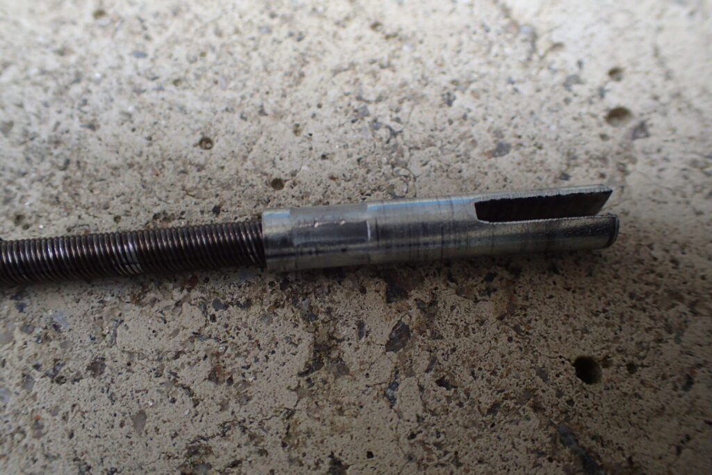 こちらはスピードメーターケーブルをフロントフォークに固定している部品ですが,ナットがはめ込まれているだけですので簡単にナットが外れて落ちます.