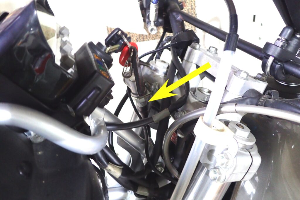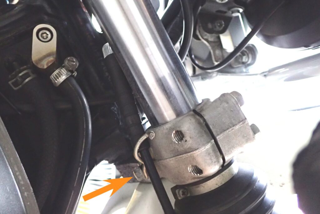 それが,フロントフォークアンダーブラケットのところにあります(オレンジの矢印部分).