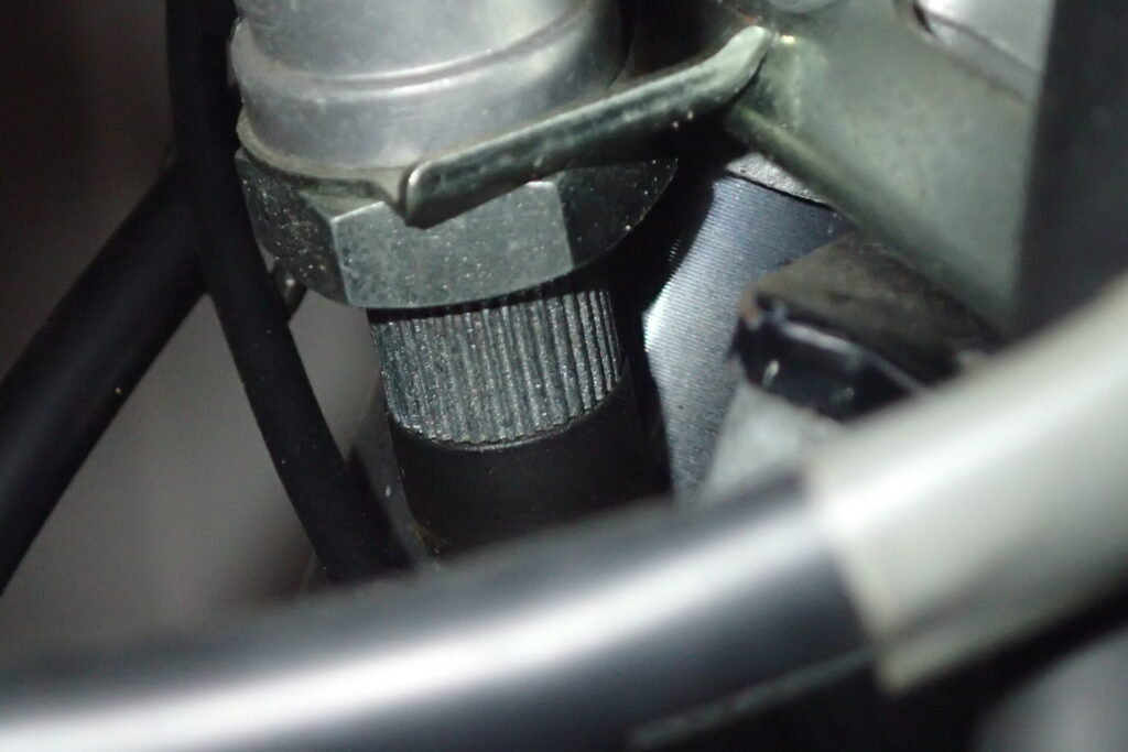 上の写真の黄色矢印で示した部分が,スピードメーターケーブルのメーター側固定箇所です.