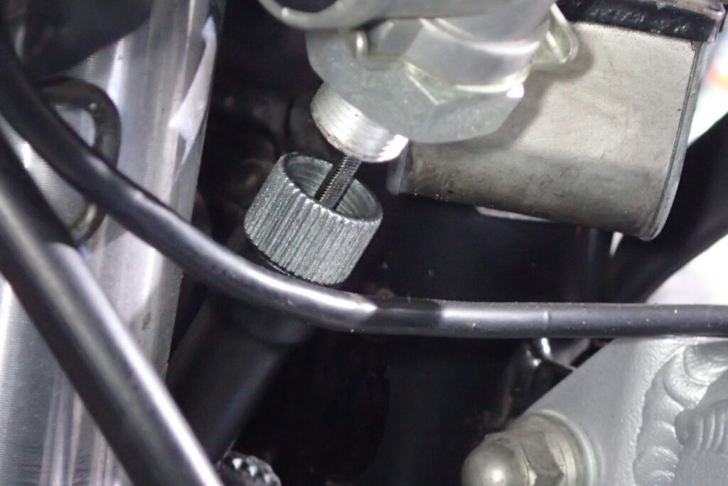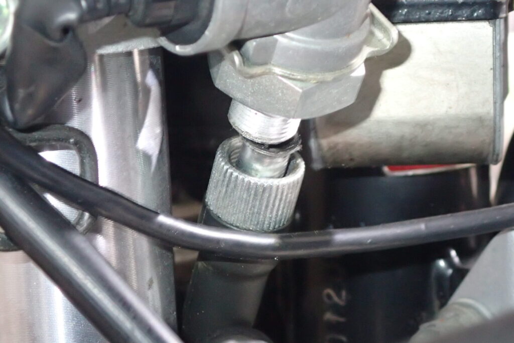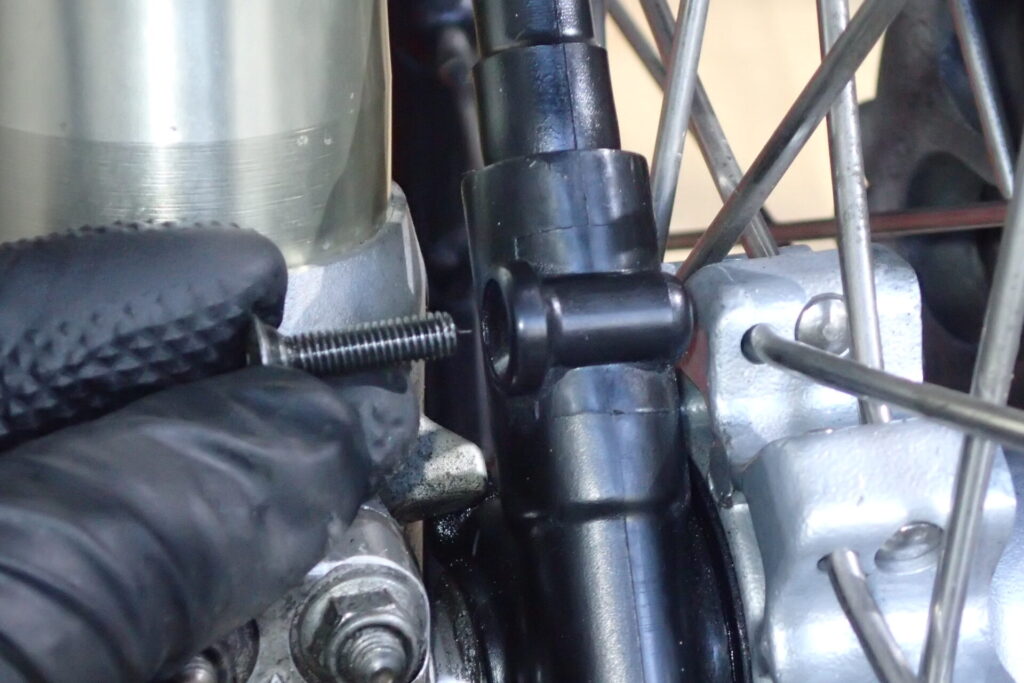 次に,スピードメーターケーブルをフロントフォークに固定している部品を外します.