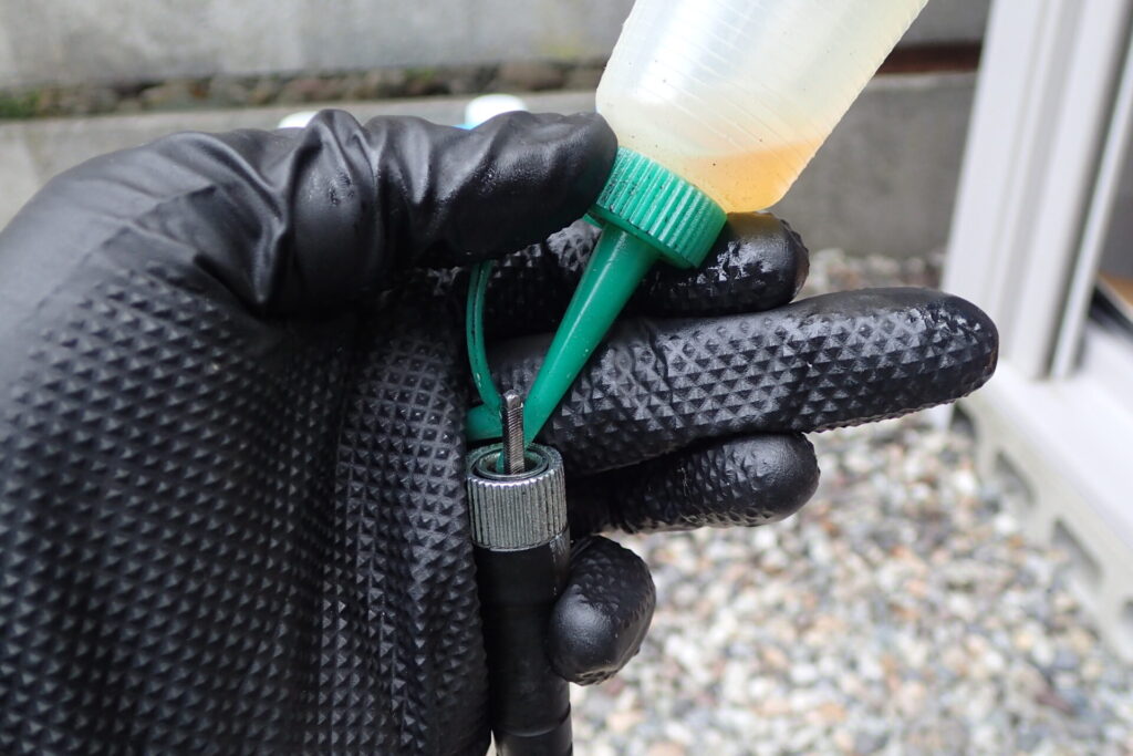 ケーブルを抜いた状態でオイル(ASH ギアオイル 75W-90)を注入します.