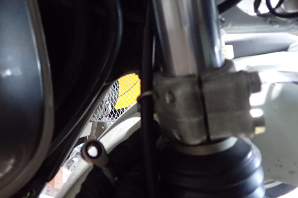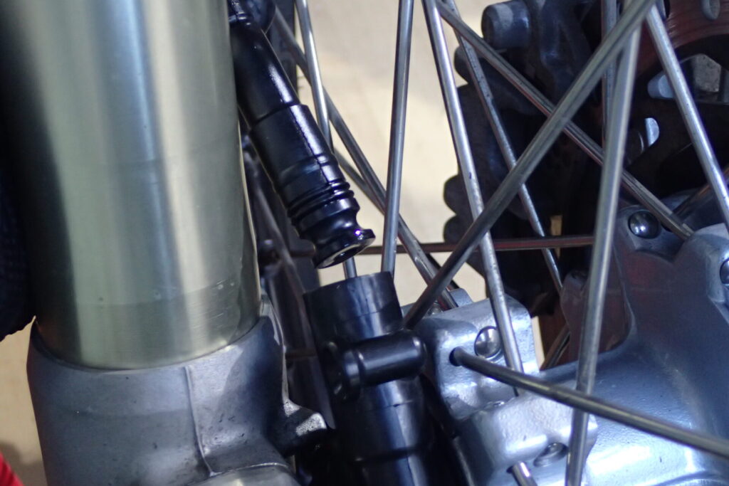 スピードメーターケーブルのタイヤ側の装着が終わったら,次はフロントフォークアンダーブラケットへの固定です.