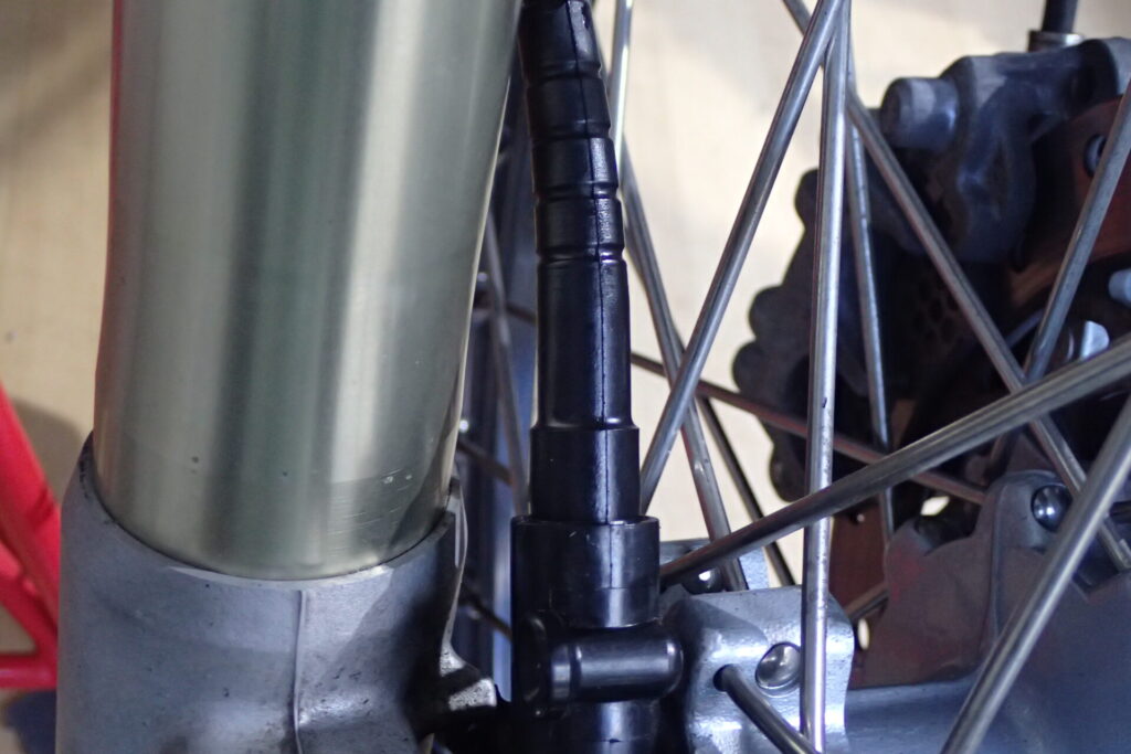 フロントフォークの脇に湾曲した黒いケーブルがスピードメーターケーブルになります.