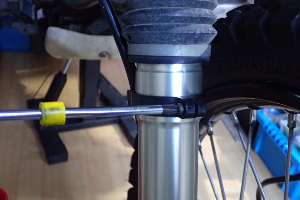 最後に,フロントフォークアンダーブラケットで仮止めしていたボルトを本締めして終了です.