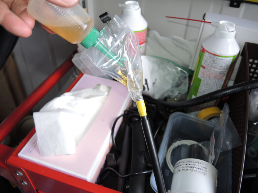 そしてビニール袋にオイルを入れれば,あとは重力がオイルをクラッチケーブル内に落としていってくれます.