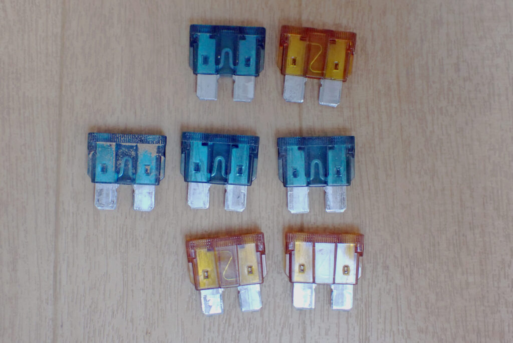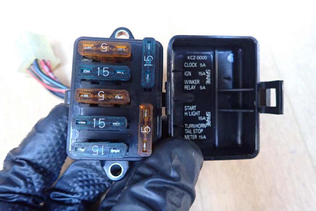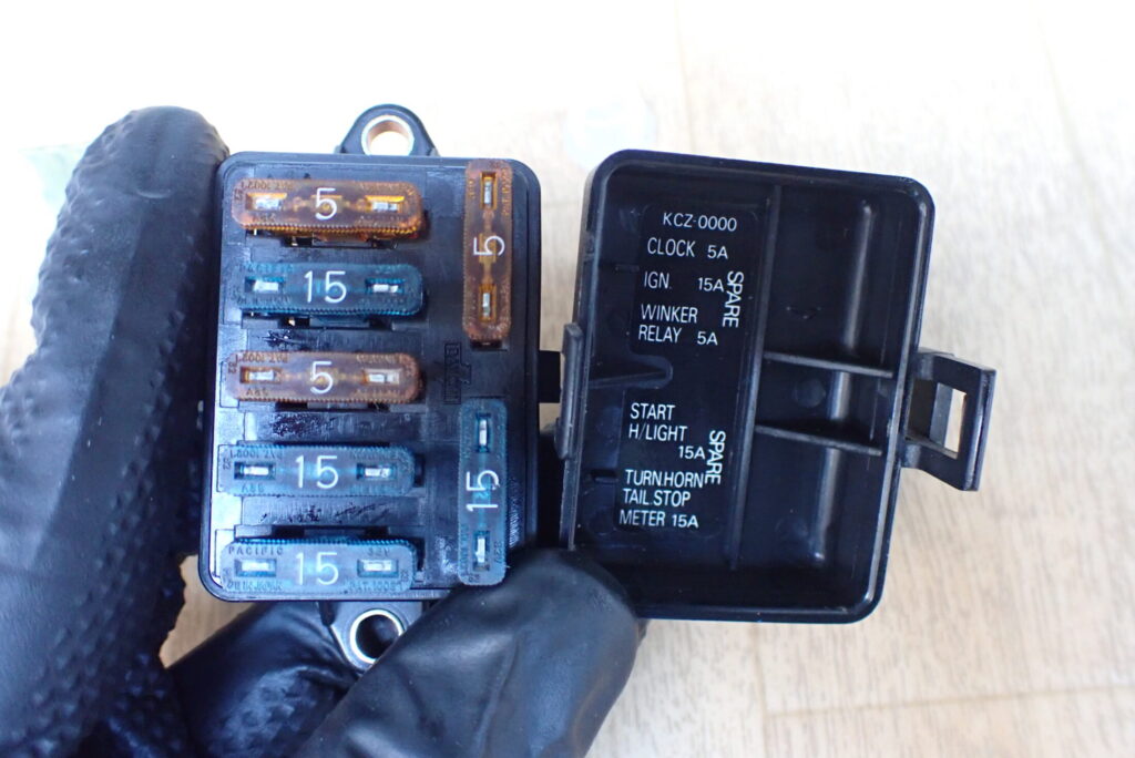 縦5つ並んでいるのが実際に使用されているヒューズで,右側に2つ付いているヒューズは予備のものです.