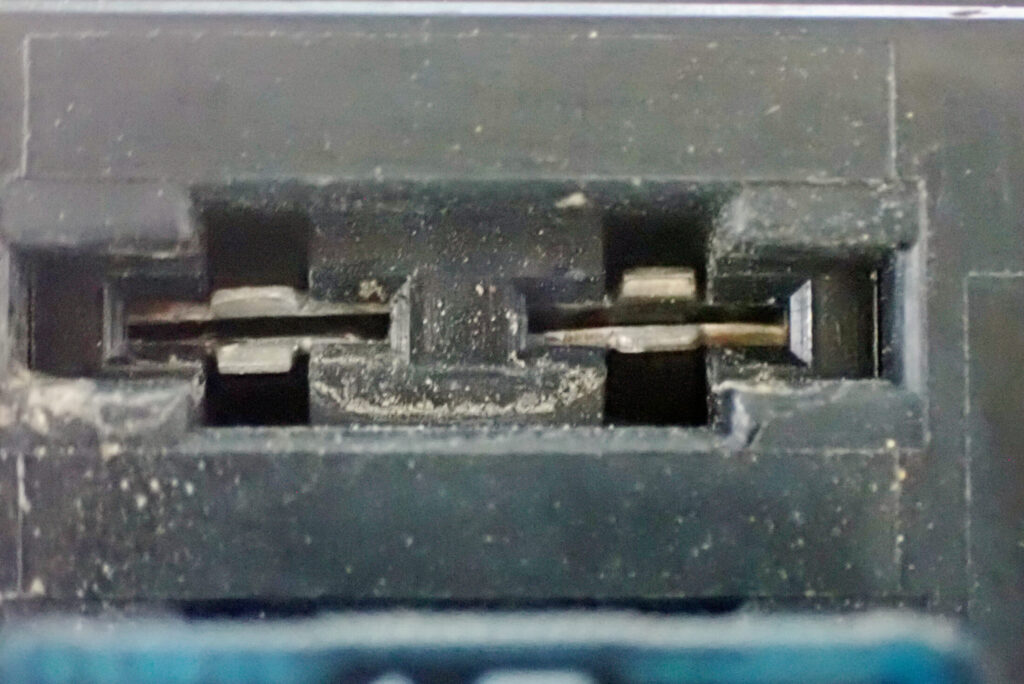 よく見ると,ヒューズを入れる場所の一番上と一番下に砂が付いているのが分かります.やはり上下の箇所は砂が入りやすいのでしょうか.
