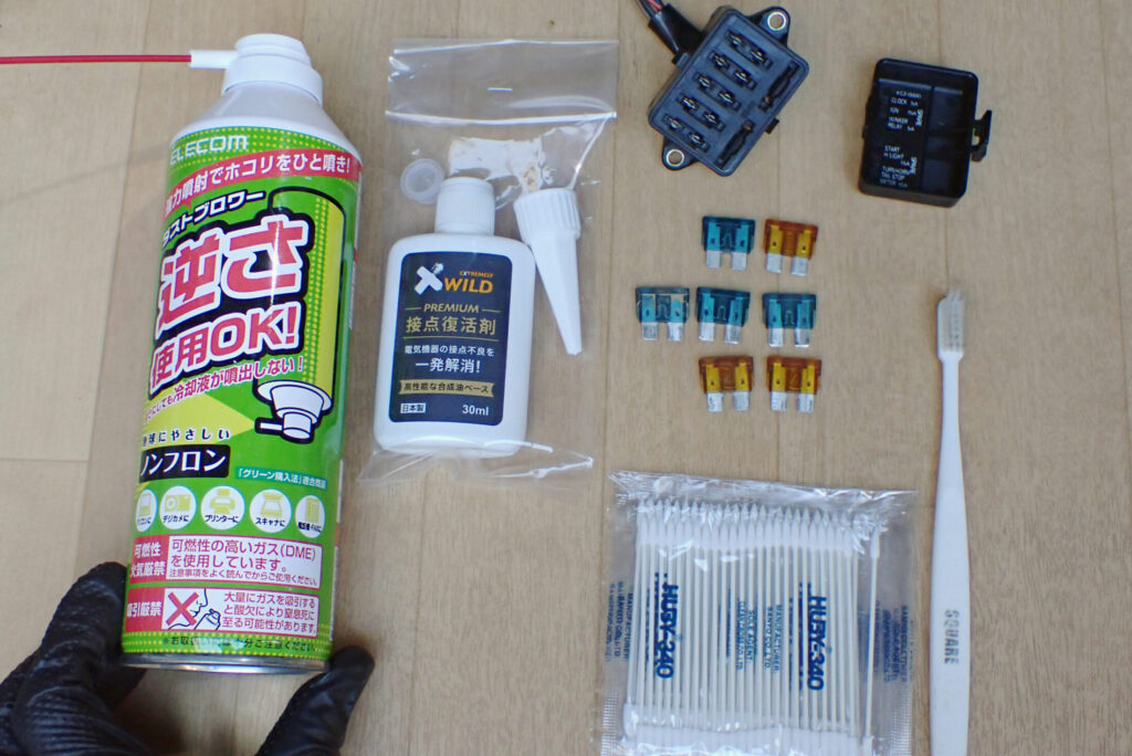 さて,ヒューズの電気の通り道を清掃するためにこれらのものを用意しました.