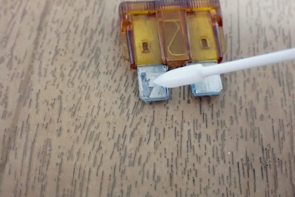 まずはヒューズの金属端子部に接点復活剤を塗布して拭き取り,接点を清掃することにしました.