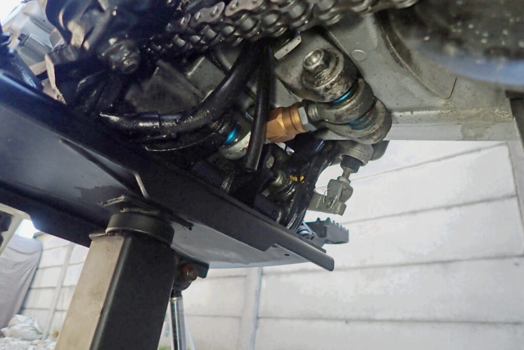 リアタイヤを外したら、スイングアーム(リンク)とリンクアームを固定しているボルトを外します(写真中央のボルト)