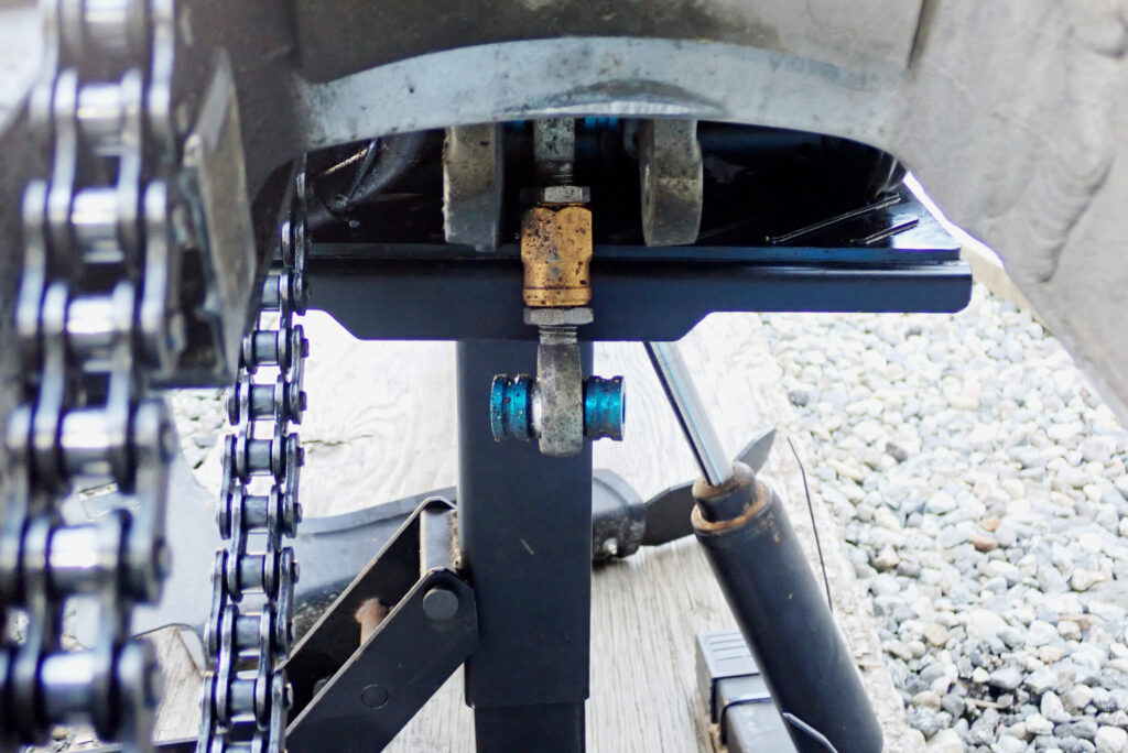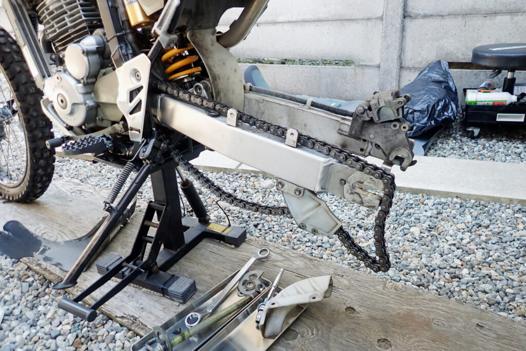 まずは車体を安定させます。リンクを外すとスイングアームが自重で落ちるため、フレームで支えるタイプのスタンドが理想です。