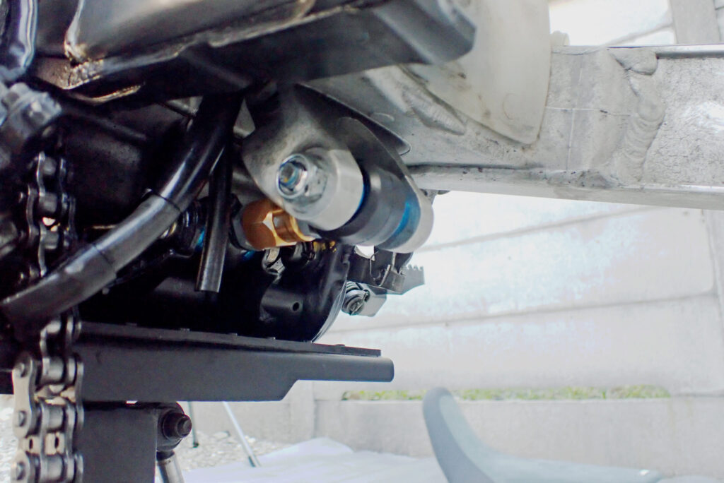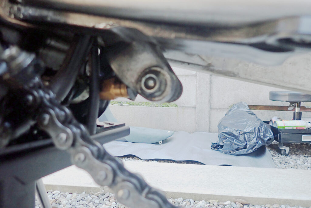 リアリンクとリンクアームが外れました。この状態になると、スイングアームは自重で垂れ下がってきますので、スイングアームが下がらないように「何か」で支えます。
