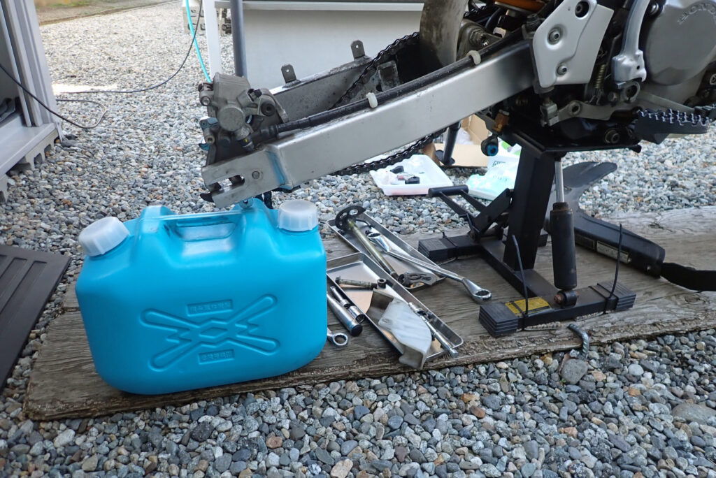 ここでは、スイングアームを10Lのポリタンクで支えています。他のバイクで同様の作業をする時は、このポリタンクを使用しています。