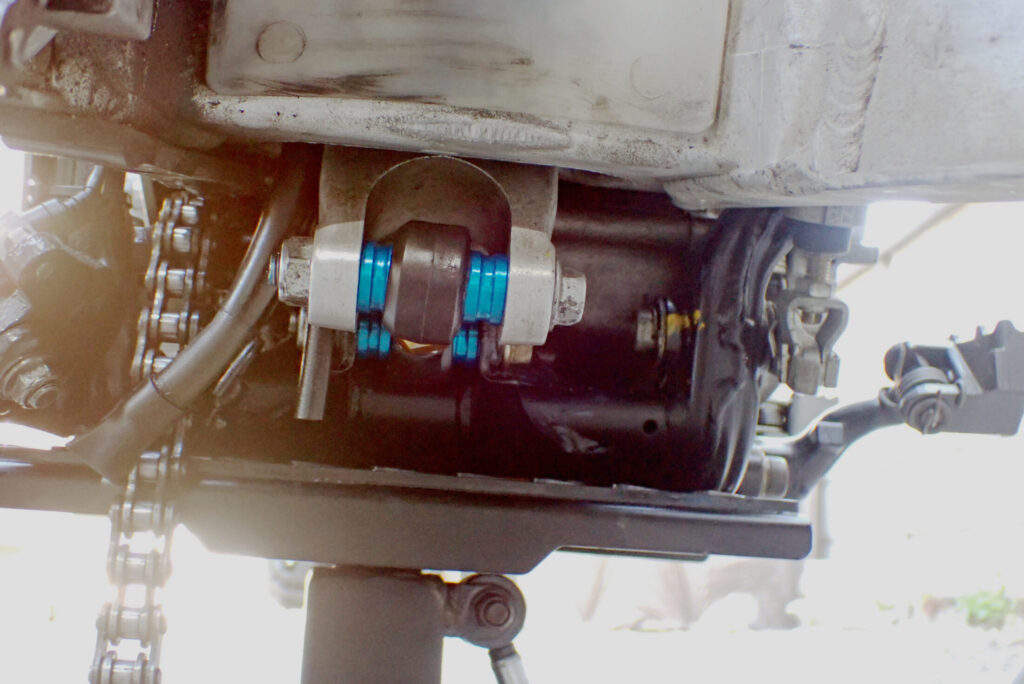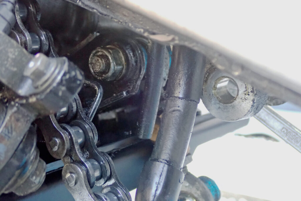 次は、リンクアームとリアリンク(スイングアーム)の連結部にボルトを挿入します。