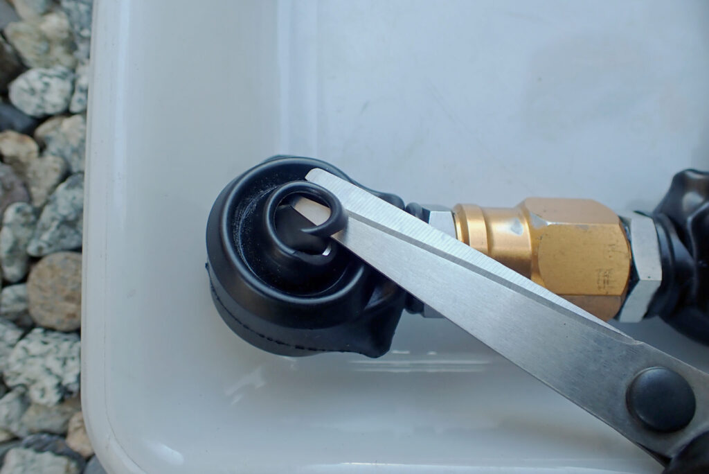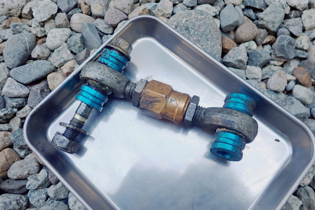 ここでは、ロッドエンド部にはWAKOSのマルチグリスを、ボルトにはオメガのグリスを使いました。使い分けの理由は、水がかかる場所かそうでないかです。