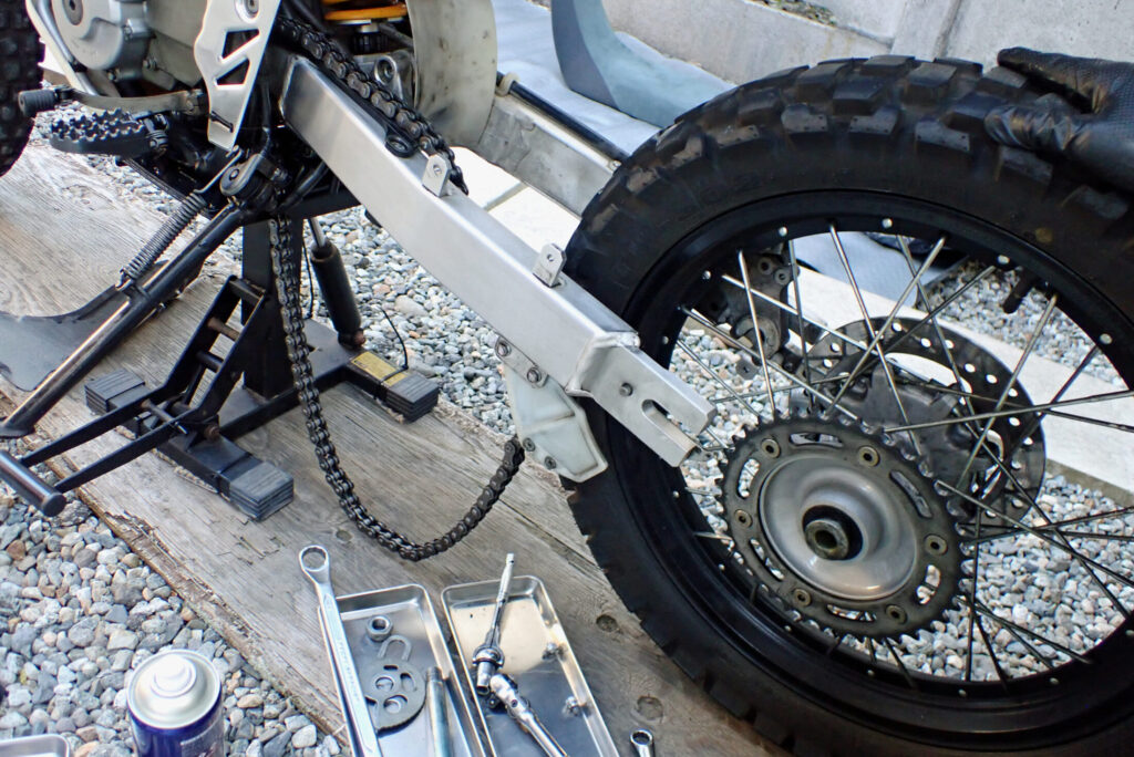 1. タイヤを外す(スイングアームの重量を軽くする)